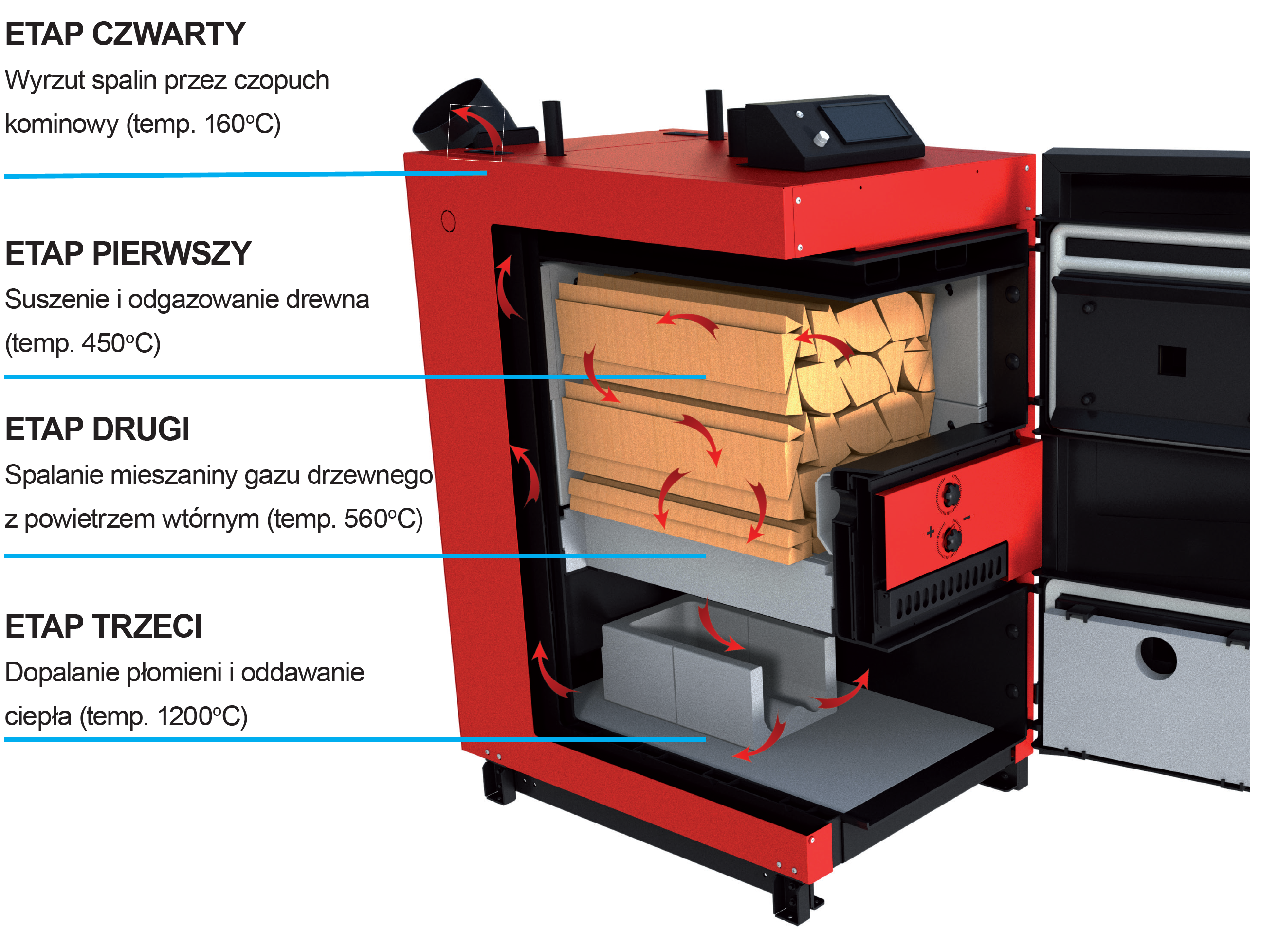 Ważne jest, aby drewno przeznaczone na opał było suche (sezonowane co najmniej 2 lata ), a jego wilgotność mieściła się w zakresie 15–18%. Sezonowanie drewna pozwala uzyskać pełną kaloryczność podczas spalania, co bezpośrednio przekłada się na dłuższy czas jego spalania. Drewno o niskiej wilgotności spala się stabilniej, równomiernie i generuje więcej ciepła w dłuższym czasie. Dzięki specjalnej konstrukcji wymiennika wyłożonego odpowiednio ukształtowaną ceramiką, zastosowaniu wentylatora wyciągowego oraz nowoczesnej kontroli procesu spalania, uzyskano wysoką wydajność przekraczającą 90%. Wentylator wyciągowy odpowiada za precyzyjny przebieg procesu pirolizy, zapewniając stabilne warunki pracy kotła niezależnie od zewnętrznych warunków atmosferycznych. Efektem takiej sprawności są wyjątkowo czyste spaliny oraz czysty proces spalania, dzięki czemu kocioł spełnia najwyższe europejskie standardy emisyjne i ekologiczne.