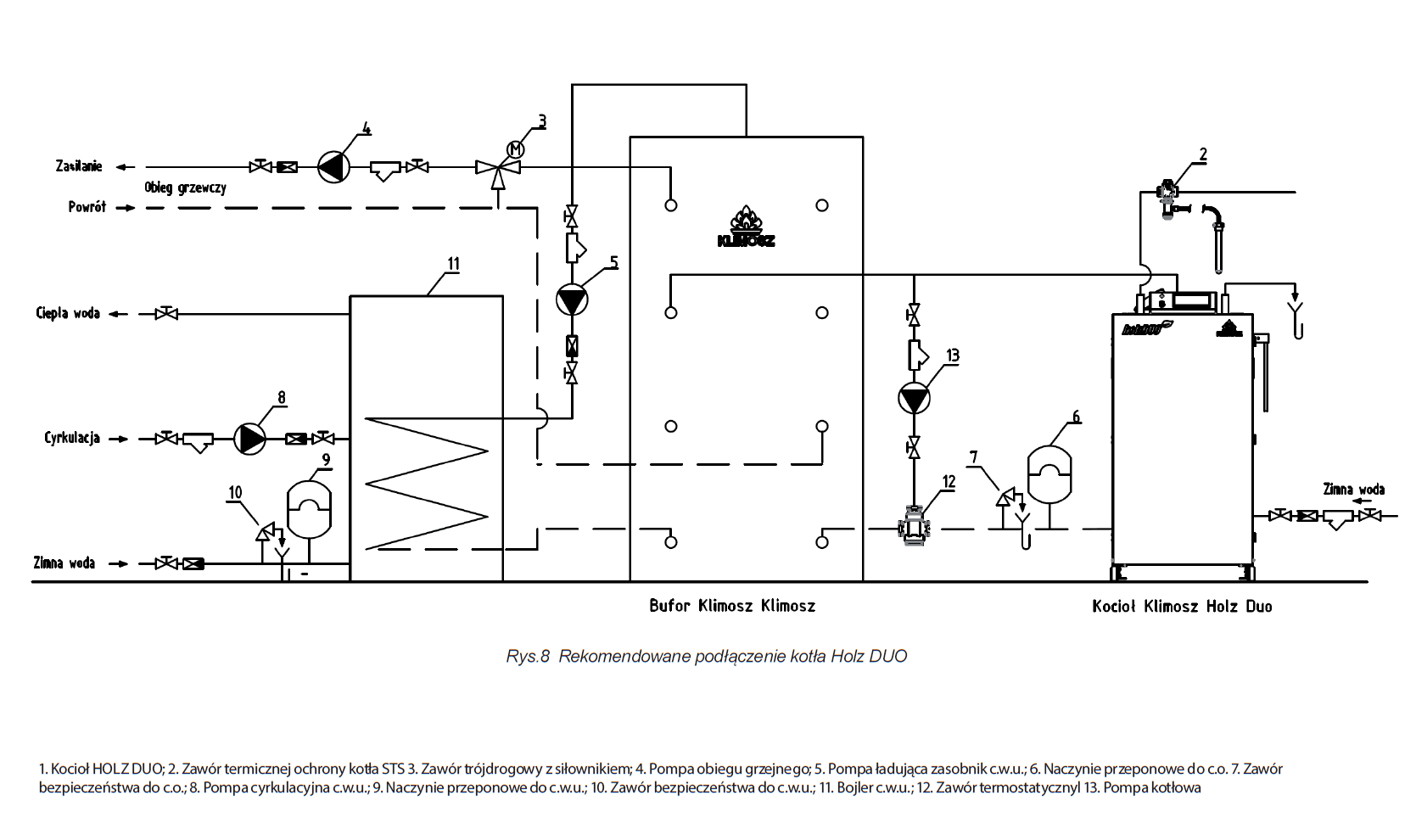 Aby zapewnić prawidłowy przebieg procesu spalania oraz bezproblemową pracę kotła, konieczne jest zagwarantowanie stałego odbioru ciepła poprzez zastosowanie zbiornika buforowego o pojemności minimum 55 l na 1 kW mocy kotła wraz z układem termicznego zabezpieczenia powrotu. Minimalna zalecana pojemność zbiornika buforowego dla modelu WALLY HOLZ DUO to 1000 l, natomiast dla uzyskania większego komfortu obsługi rekomenduje się pojemność 1500–2000 l.